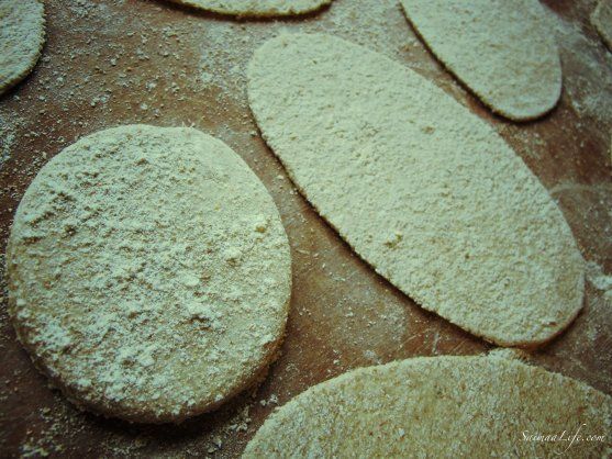 Rouler chaque morceaux en petite boule puis l'étaler sur une surface farinée jusqu’à obtenir un ovale d’environ 20 cm de long (1 mm d’épaisseur). Et placer chaque disque de pâte sur un morceau de papier parchemin individuel.