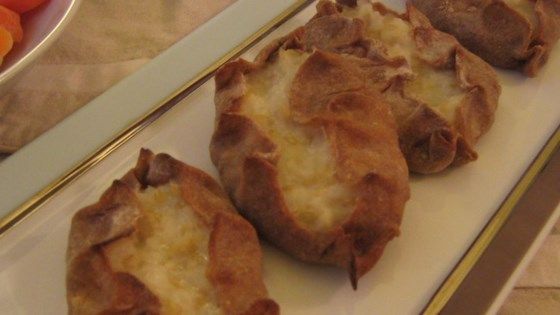 On a lightly floured surface, roll each piece of dough out into a thin circle 6 inches in diameter. The dough should be as thin as possible. Place about 3 tablespoons of the rice mixture in the center of each circle. Spread the mixture out to within 1 inch of the edges. Fold the edges of the dough upward, and crimp the edges so as to allow the pastries to hold their shape. Pinch the sides at each end to form a little boat. Place pastries about 3 inches apart on an ungreased baking sheet, and brush the tops with butter.